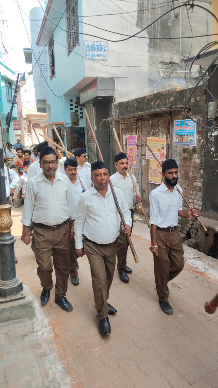 : नगर में संघ कार्यकर्ताओं ने निकाला पद संचलन, फूल बरसे